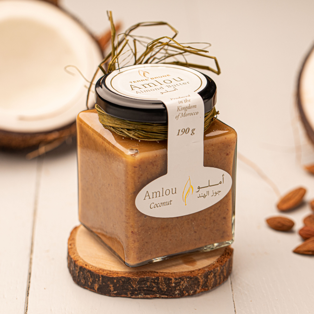 Amlou noix de coco est la pâte à tartiner marocaine d’origine berbère au goût nougat. Elle est produite à base d’amandes, d’huile d’argan, de miels et d'arôme naturel de noix de coco.
