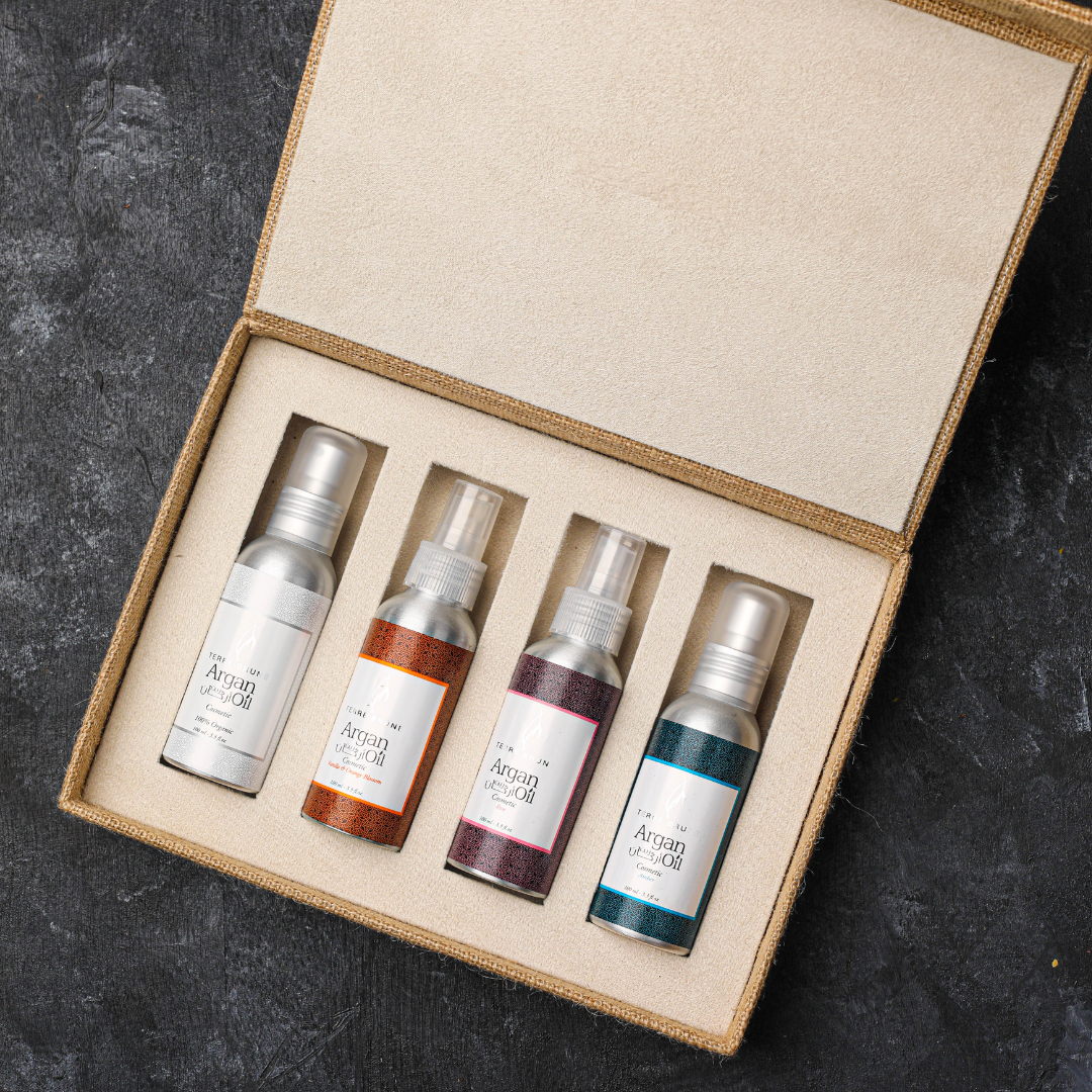 Notre coffret Argan cosmétique contient 4 Huiles d’Argan cosmétiques 100ml au choix :